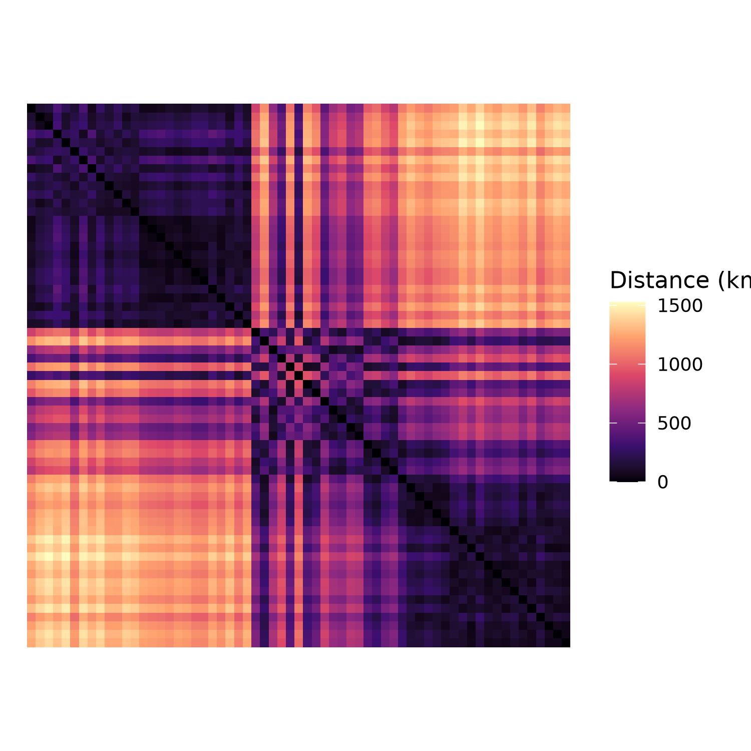 coord_fixed() + labs(fill = "Distance (km)") + theme_void()
