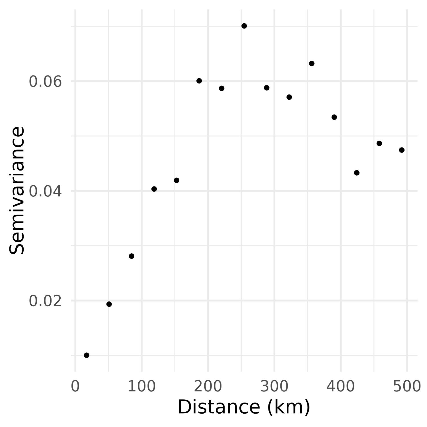 ggplot(vg, aes(x=dist, y=gamma)) + geom_point() + labs(x = "Distance (km)", y = "Semivariance")@article{mondon2025,